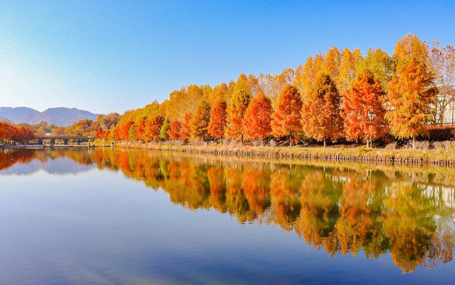 길게 늘어선 단풍나무들이 잔잔한 물에 비치는 모습이 마치 그림 같습니다.